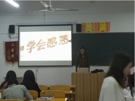 在活动上,由辅导员肖宇担任主持,她通过名人警句引出感恩主题,提出问题启发学生进行思考,同时鼓励引导学生发掘感恩的实质,倡导学生要学会感恩的精神,并用实际行动去践行感恩的精神。