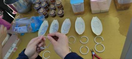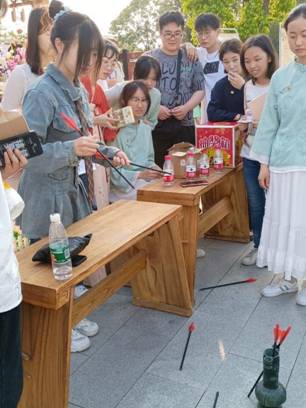 投壶既是一种礼仪,又是一种游戏;既可以修身养性,又有健身的意义。在投壶活动中,参与者可通过得筹情况获得抽奖资格,抽取的奖品有别具一格的品茗杯、精美茶包、古色古香的明信片等。手工制作活动中,师生们自由发挥想象,制作不同风格的首饰,体会DIY制作过程中的乐趣。