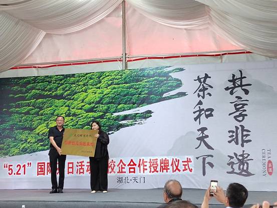在陆子茶道院,天门市“5.21”国际茶日活动暨校企合作授牌仪式举行。天门职业学院陆羽国际茶文化艺术学院院长温莎作为高校代表发言。天门职业学院陆羽国际茶文化艺术学院党总支书记曾娟代表学校与陆泉农业科技有限公司签署校企合作战略协议。天门职业学院党委副书记、校长熊安锋为陆泉农业科技有限公司授予 “天门职业学院创新创意实践基地”牌匾,标志着双方的校企合作进入全新深度融合阶段。