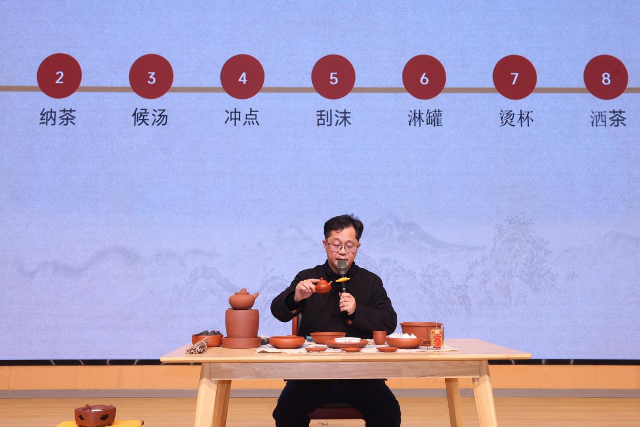 第三位主讲嘉宾是潮汕工夫茶文化学者、韩山师范学院茶艺学讲师林宇南,他带来“非遗工夫茶的人文解读”,从历史渊源、冲泡技艺、礼仪规范等维度,阐释了潮汕工夫茶背后蕴含的“和、敬、精、洁”人文精神,让观众深刻体会到非遗文化的鲜活生命力。最后,湖州陆羽茶文化研究会副会长、“中华茶文化传播优秀工作者”、“重走陆羽路”发起倡导者吴震,以“跨界联动,共筑‘陆学’新高地”为题,提出湖州、天门、宜兴三地深化茶文化资源整合、推动“陆学”跨界融合发展的倡议,为茶文化的创新传播提供了新思路、新路径。