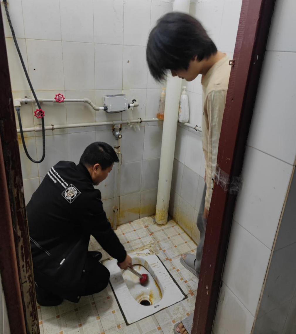 刘超老师以身作则,引领寝室卫生新风尚,亲自示范刷蹲便器技巧。
