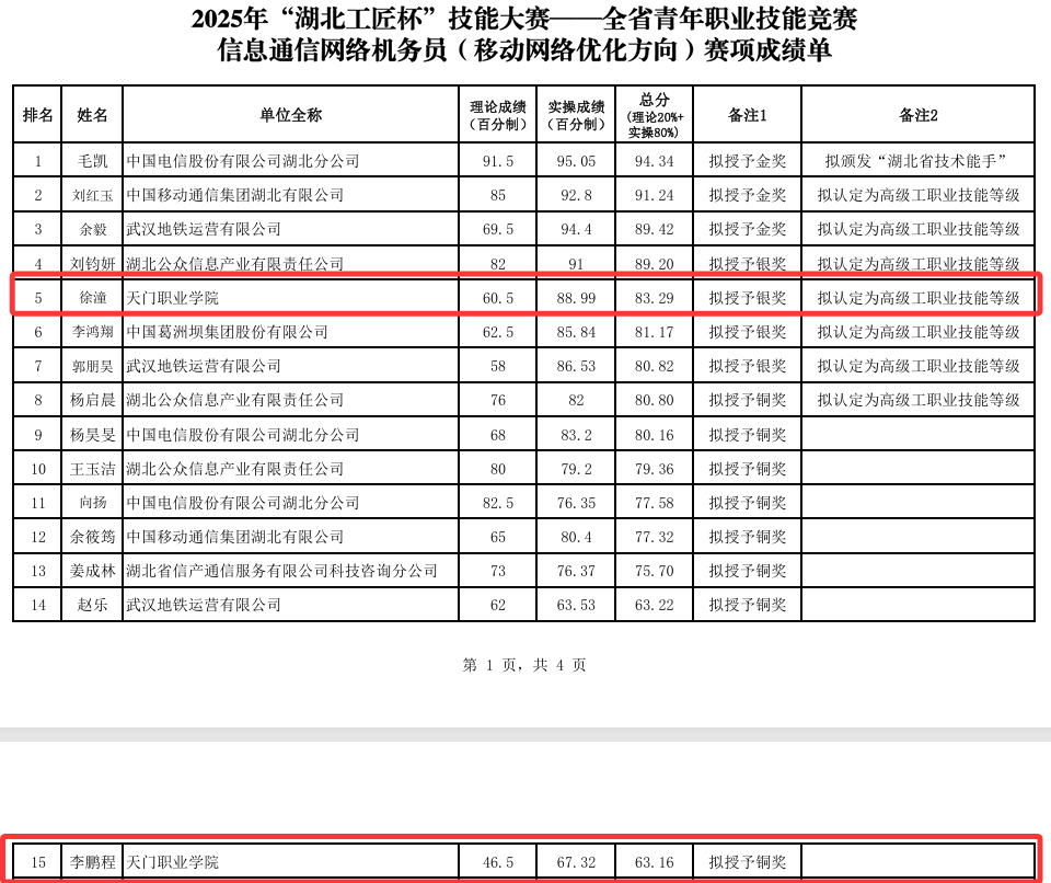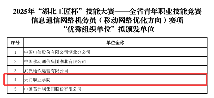 近日,由湖北省人力资源和社会保障厅、共青团湖北省委共同主办的2025年“湖北工匠杯”技能大赛——全省青年职业技能竞赛信息通信网络机务员(移动网络优化方向)赛项在湖北省邮电学校圆满落幕,全省23家单位、50名选手参赛。天门职业学院电子信息技术学院教师徐潼、李鹏程凭借过硬的专业技能,从强手如林的赛场中脱颖而出,分别获得银奖和铜奖,天门职业学院获得“优秀组织单位”荣誉称号。