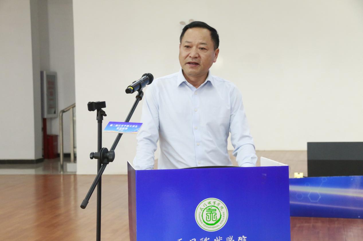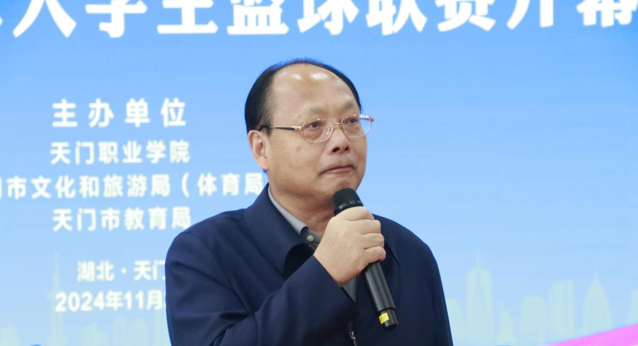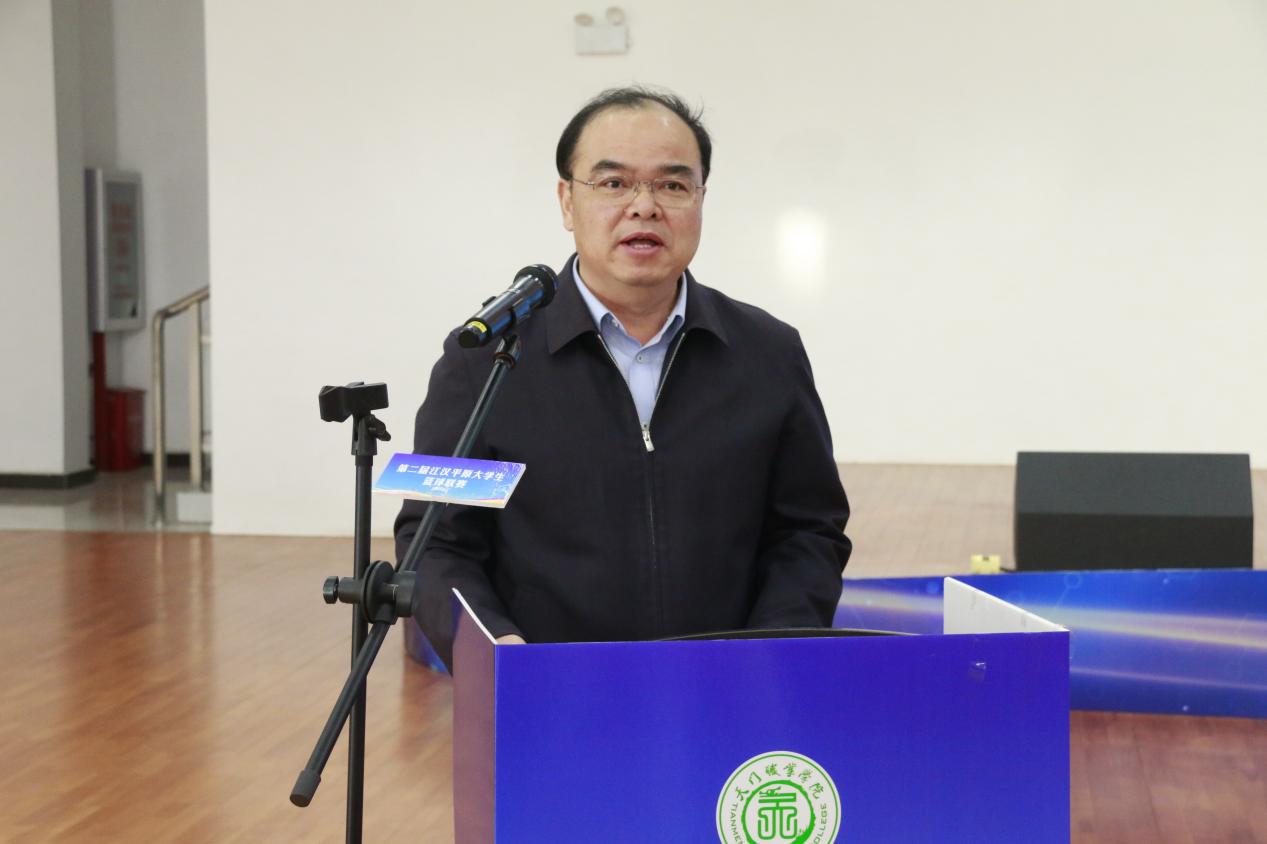 天门职业学院党委副书记、校长熊安锋代表学校向出席本次赛事的嘉宾和领导,向来校参赛的队伍表示热烈欢迎,向为本次赛事付出辛勤努力的全体工作人员表示衷心的感谢。他表示,学校历来高度重视体育工作,坚定不移推动“五育并举”,全力构建德智体美劳全面培养的教育体系,为学生终身发展和幸福成长奠基,学校体育教学改革和体育竞技成绩显著。希望以此次比赛为契机,搭建展示自我、交流技艺、增进友谊的平台。