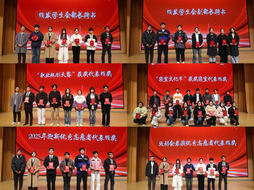 大会在庄严的国歌声中拉开序幕。在聘书颁发与表彰环节,院领导依次为学院学生会主席团成员、各部门部长及副部长颁发聘书,并为职业规划大赛获奖代表、寝室文化节获奖寝室代表,以及2025年迎新工作和运动会表演中的优秀志愿者颁发荣誉证书,充分肯定了学生骨干的责任担当与先进集体的青春风采。