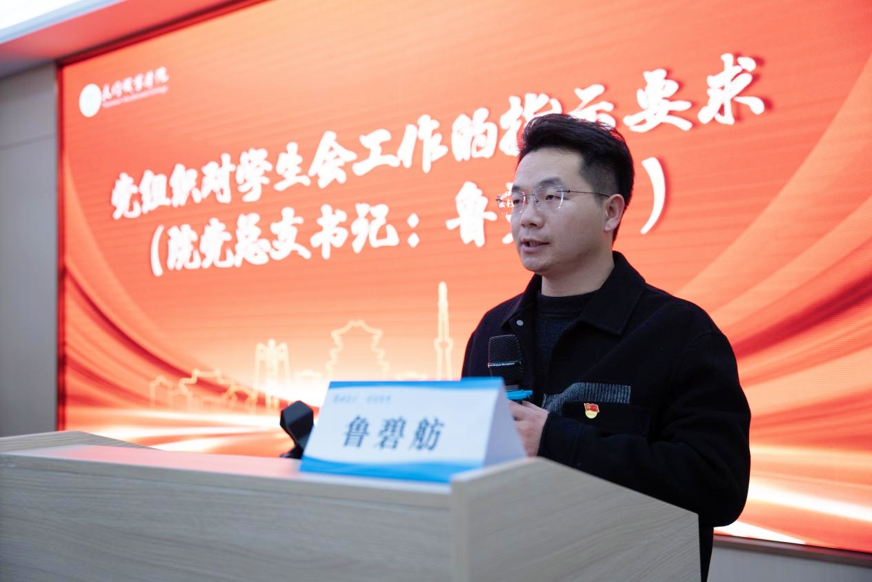 大会在庄严的国歌声中拉开序幕。学院党总支书记鲁碧舫首先代表党组织发表讲话,为学生会工作指明方向、提出期望。鲁碧舫强调,第一届学生会必须坚定政治方向,建设成为讲规矩、靠得住的坚实组织;必须聚焦服务宗旨,建设成为接地气、办实事的暖心组织;必须勇担时代使命,建设成为敢创新、走在前的先锋组织。勉励全体学生骨干和代表,要将个人理想融入国家发展大局,在服务同学、奉献学院的实践中锤炼本领,担当起新时代赋予青年的光荣责任。受学院第一届学生会委托,谢黄喆同学向大会作工作报告,系统总结2025年工作成效,并提出以“品牌化、常态化、实效化”为核心的2026年发展规划,报告获大会审议通过。