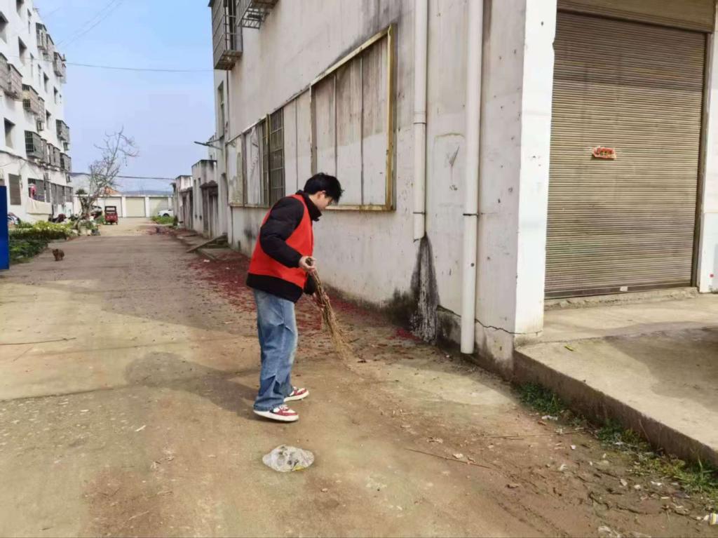 2026年寒假,建筑装饰工程技术2501班的闵子靓同学回到湖北省随州市随县厉山镇王家岗村,积极投身到“返家乡”社会实践活动中,主动参与社区环境整治工作。他认真清扫街道、清理垃圾、维护公共区域卫生,并协助村委会整理内务、归置资料。