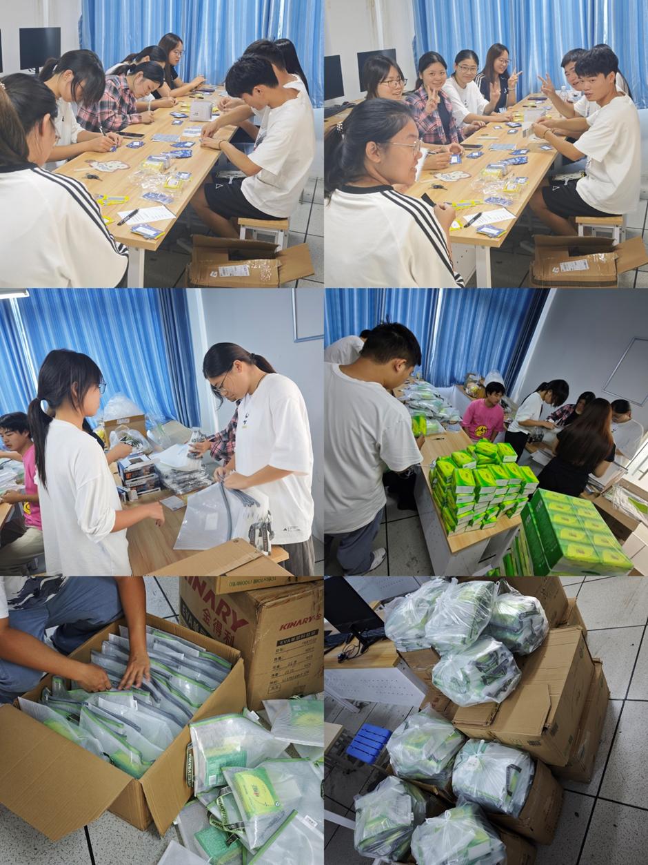 与此同时,新生礼品分装工作也在有条不紊地进行。志愿者们分工协作,将各类物资逐一清点、分类、打包,组装成一份份饱含心意的新生礼包。每一份礼袋不仅装有实用的学习生活用品,更承载着学院对新同学的欢迎与关怀。现场欢声笑语不断,志愿者们虽忙碌却充满干劲,纷纷表示:“希望新生们一到校就能感受到‘家’的温暖!”