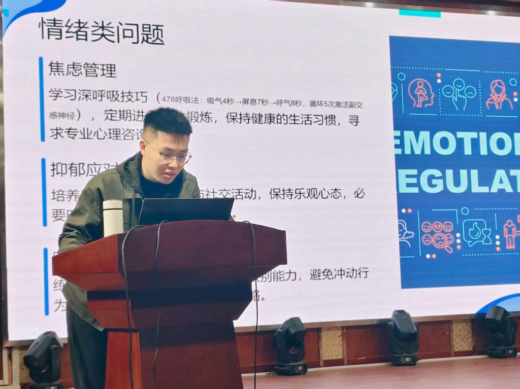 为深化校园心理健康教育工作,强化班级心理委员的朋辈互助能力,11月20日,我校心理中心主办的第二期心理委员培训在C栋报告厅顺利举行。本次培训以“常见心理问题的识别与应对”为主题,由智能制造学院万祖宇老师主讲,全校心理委员、阳光心理社团的成员共同参加了本次培训。