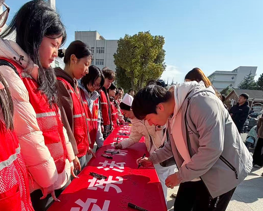 活动现场布置了“学宪法·讲宪法·共筑法治校园”的红色横幅以及宪法知识宣传展板。在工作人员的引导下,同学们有序排队,在主题横幅上郑重签下自己的名字,许下自觉维护宪法尊严、争做守法公民的庄严承诺。活动现场秩序井然,气氛庄重热烈,充分展现了我校青年学子对宪法的尊崇和坚定信仰。