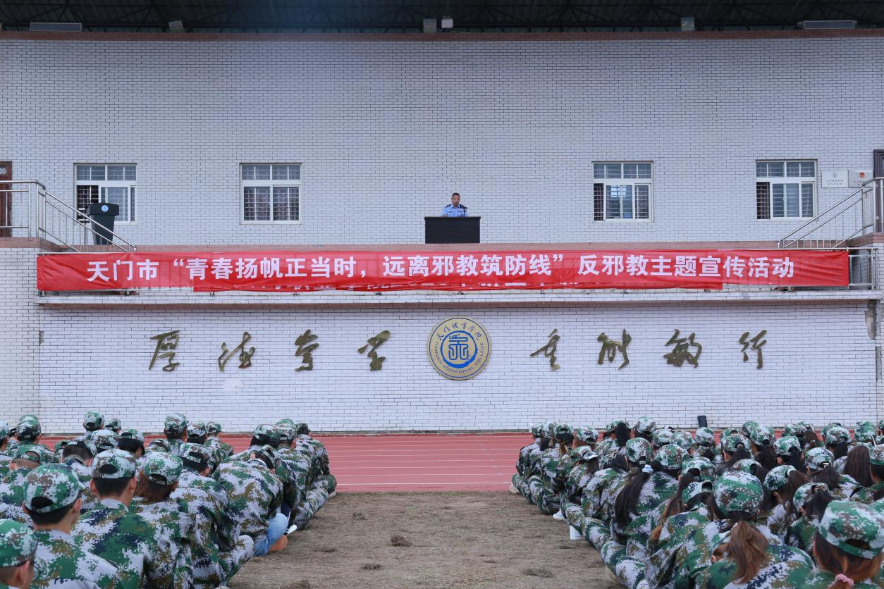 为进一步增强全校师生对邪教危害的认知能力,筑牢校园思想安全防线,引导青年学子树立正确世界观、人生观、价值观,2025年9月24日,天门职业学院联合市委政法委、市公安局、市科协在田径场成功举办“青春扬帆正当时 远离邪教筑防线”反邪教主题宣传活动。学校党委委员、副校长杨恒波主持并讲话,3500余名师生代表踊跃参与,共同接受反邪教思想教育。
