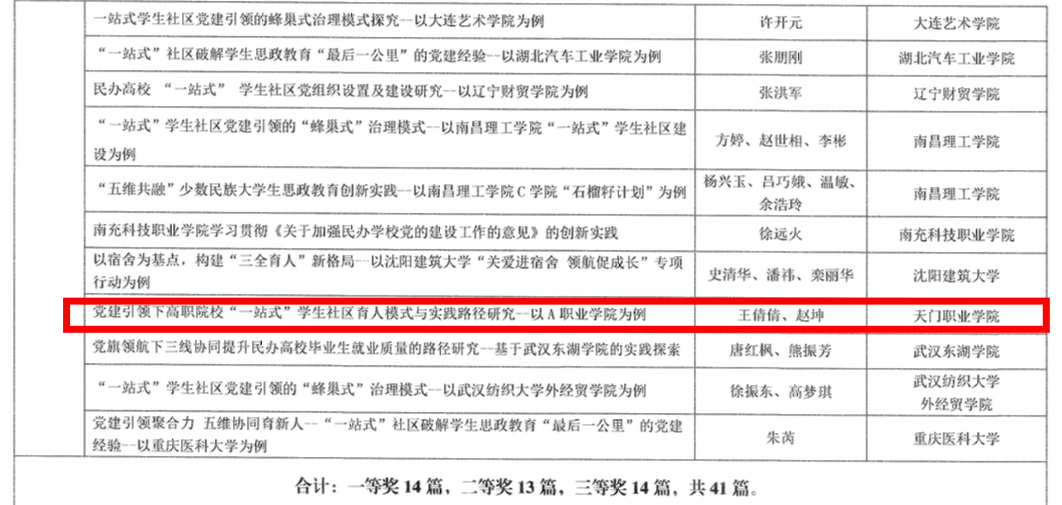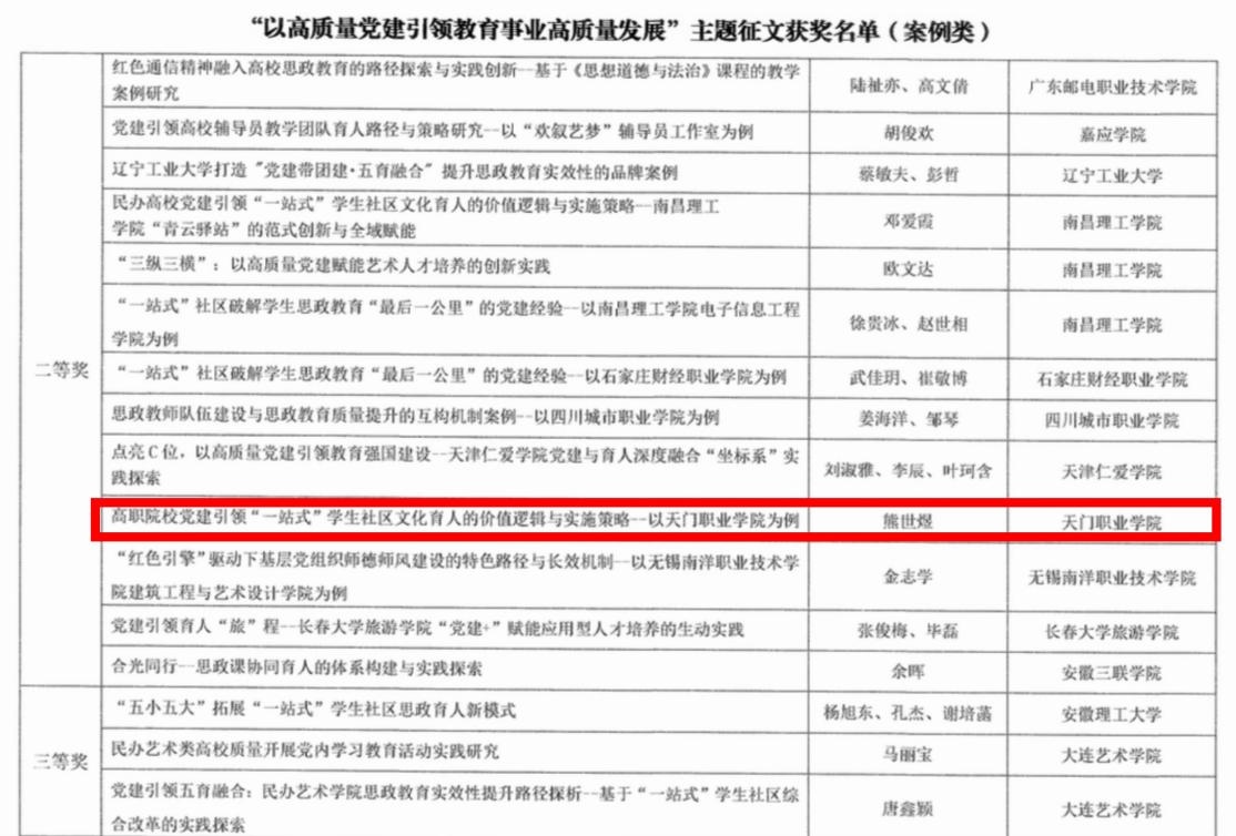 其中,熊世煜老师独立撰写的《高职院校党建引领“一站式”学生社区文化育人的价值逻辑与实施策略——以天门职业学院为例》荣获案例类二等奖。王倩倩、赵坤老师共同署名的《党建领引下高职院校“一站式”学生社区育人模式与实践路径研究——以A职业学院为例》荣获案例类三等奖。