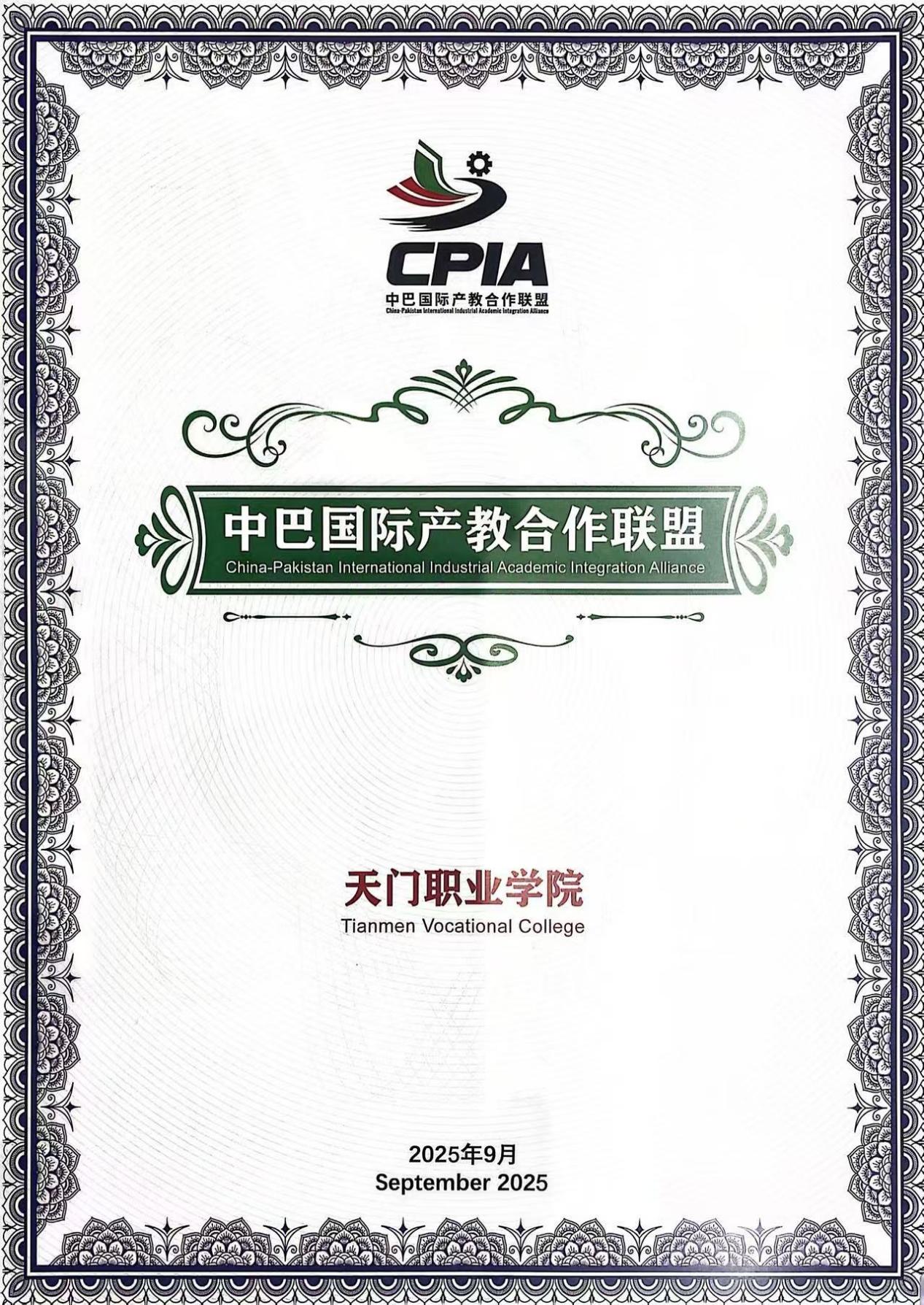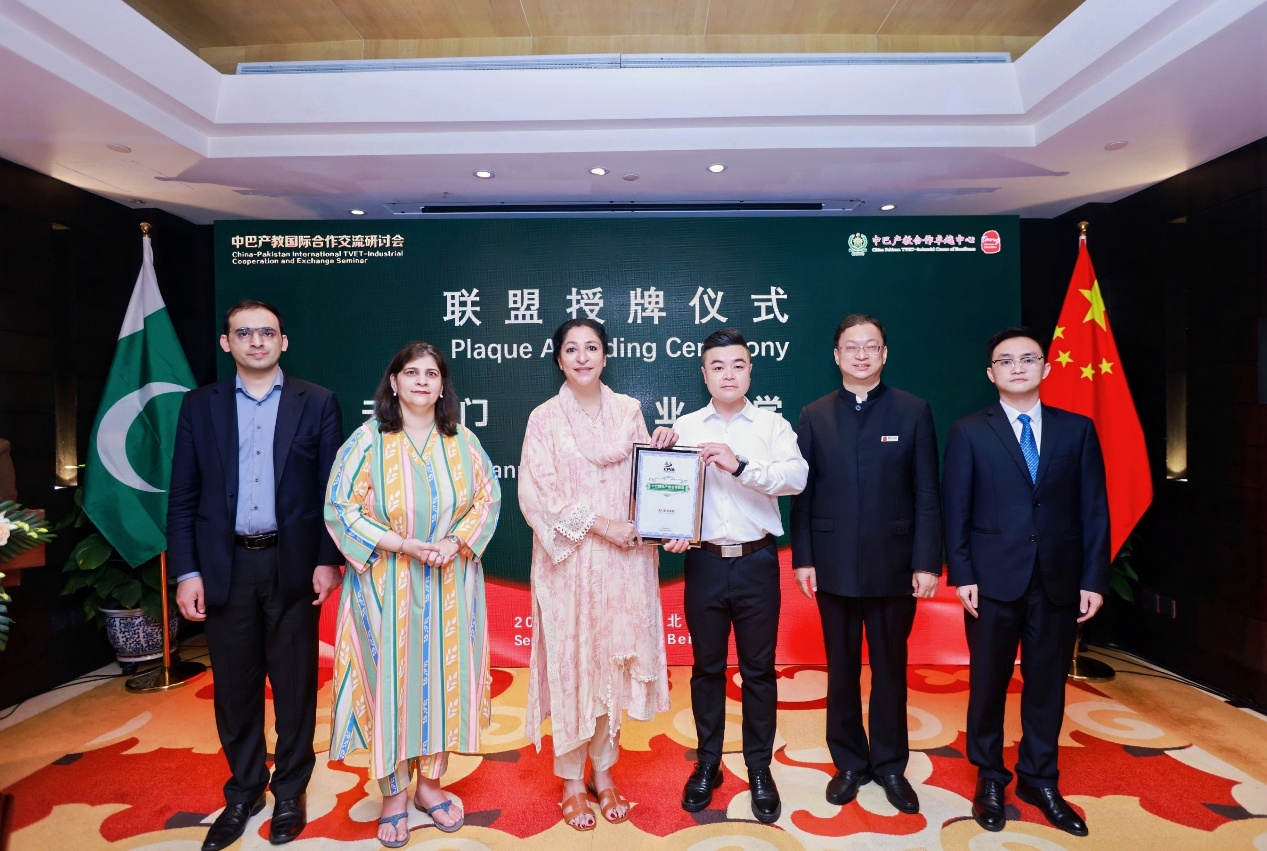 9月25日,由中巴产教合作卓 越中心主办的“中巴产教国际合作交流研讨会”在北京召开。巴基斯坦联邦教育与职业培训部国务部长瓦吉哈·卡马尔女士、巴基斯坦国家职业技术教育委员会主席吉尔米娜·比拉尔·艾哈迈德女士、唐风国际教育集团总裁李劲松等嘉宾出席会议并致辞。 天门职业学院应邀派服装与经济管理学院党总支书记雷鹏作为代表参会, 并与中巴产教合作卓越中心签 署谅解备忘录, 正式加入中巴国际产教合作联盟,成为推动中巴职业教育协同发展的重要力量。