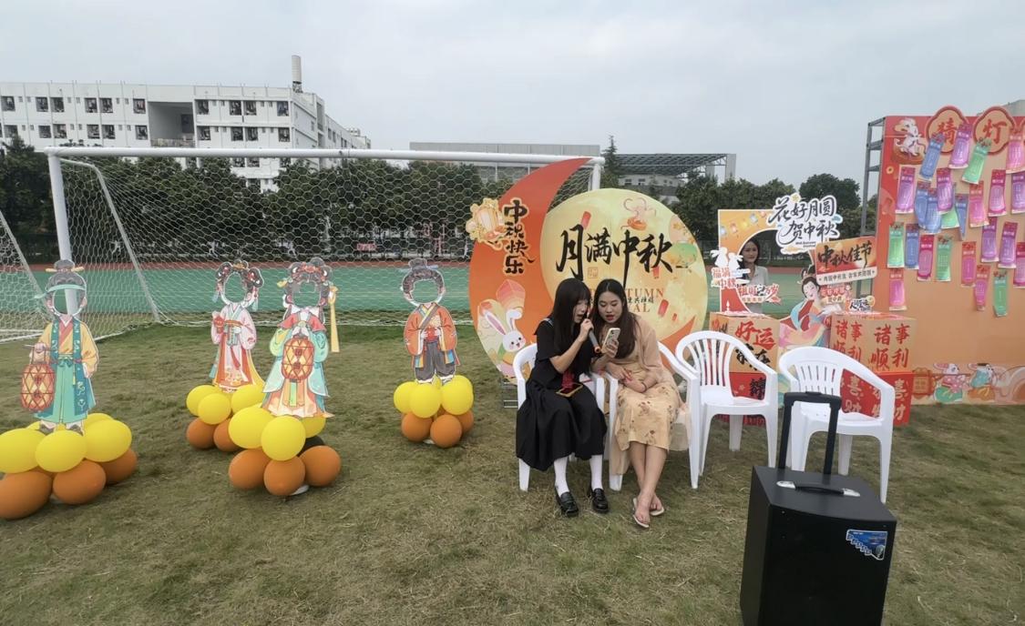 活动现场,处处洋溢着中秋的诗意与青春的朝气。“拍照打卡领抽奖券”区域,以“月满中秋”“花好月圆贺中秋”等为主题的美陈装置,巧妙融合了传统中秋元素与现代艺术审美,成为校园里一道靓丽的风景线。同学们或驻足于造型别致的“月亮”之下,或与憨态可掬的玉兔形象同框,将自己与中秋盛景定格在镜头中,再通过社交平台分享这份节日的喜悦,换取抽奖券,每一张照片都承载着对传统佳节的美好期许。