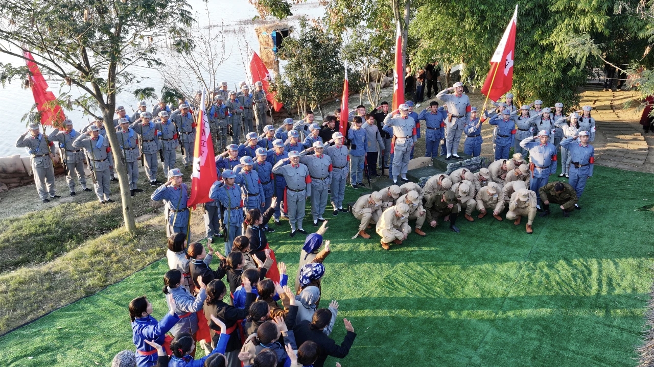 《文家墩大捷》生动艺术地再现了1932年春季,贺龙同志率领工农红军第三军在天门文家墩一带巧妙布阵、英勇歼敌,最终取得俘敌2000余人辉煌胜利的光辉战例。演出中,剧情紧凑跌宕,场面宏大震撼,将红军将士不畏艰险、英勇奋战的革命气概与军民同心、鱼水情深的感人历史刻画得淋漓尽致。我校参演学子全情投入,以饱满的热情和认真的态度,精准诠释了革命先辈与人民群众的形象,他们铿锵有力的动作、真挚动人的表演,赢得了现场观众阵阵热烈的掌声。