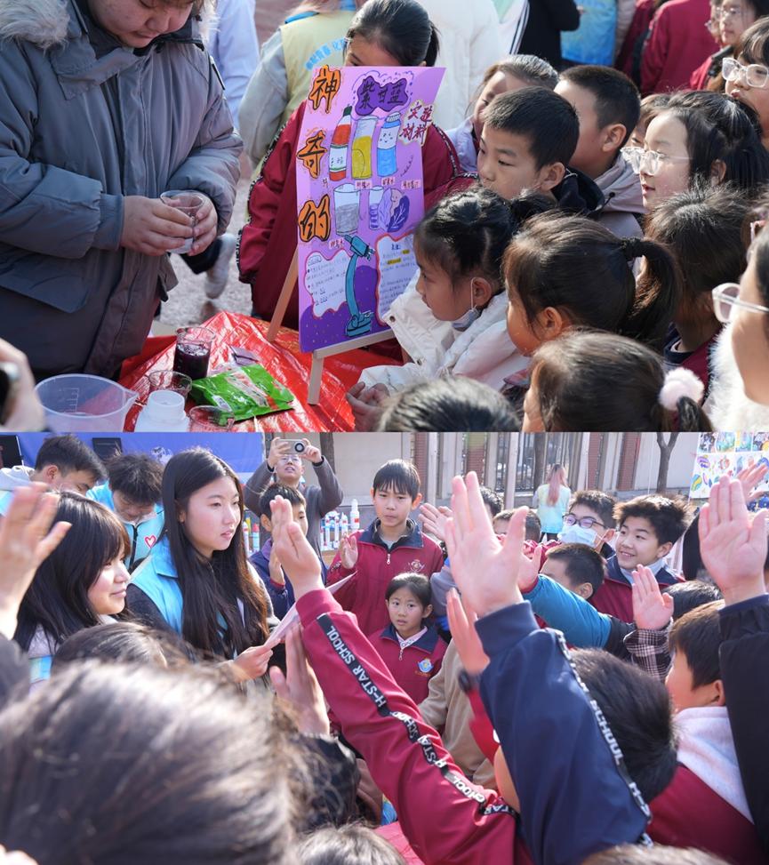 学院倾力打造的实验互动集市成为本次活动的核心环节。活动设置了三大安全有趣的实践挑战区,将操场变为开放式探索乐园。学生们在一对一指导下,兴致盎然地合成“迷你法老蛇”、调配绽放的“彩虹牙膏”,运用紫甘蓝汁破解溶液的酸碱性密码,观察魔幻般的色彩变幻。贯穿始终的科学快问快答环节,将动手实践中萌生的为什么即时转化为知识互动,形成了观察-动手-思考的完整探究闭环,让每位参与者从观众转变为全身心投入的“小小科学家”。在此过程中,学院师生完美扮演了知识传授者、安全守护者与探索引路人的多重角色。