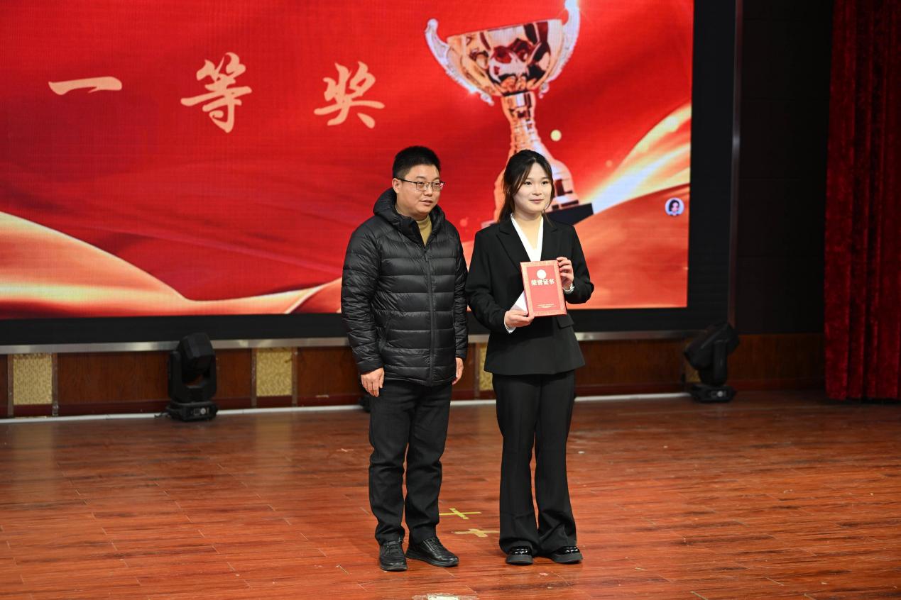 激动人心的颁奖环节成为现场焦点。公共课部主任赵坤受邀为一等奖获得者张译文颁奖,他亲手将荣誉证书与奖品递到选手手中,寄语道:“以声传文,以情载道,希望你继续深耕经典,做中华文脉的坚定传承者。”台下随即响起热烈掌声,见证这份实至名归的荣誉。随后,人事处副处长陈让为二等奖获得者李思仪、柳栋颁奖,他与两位选手亲切握手,鼓励他们保持对诗歌的热爱,在文化传承的道路上稳步前行。公共课部副主任林伟为陈柯颖、王梓璇、范婷三位三等奖获得者颁发荣誉证书,逐一肯定了她们在舞台上的精彩表现与背后的不懈付出。最后,公共课部英语教师张萍为张婵、沈思咏等优秀奖获得者颁奖,温柔地叮嘱与赞许的目光,让选手们感受到满满的鼓励与认可。整个颁奖过程秩序井然,掌声此起彼伏,每一份荣誉都承载着对选手们文化素养与语言功底的高度肯定。