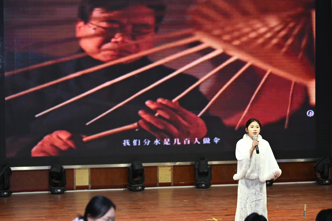大赛自启动以来,得到全校学子积极响应,经过初赛的激烈角逐,最终茶文化2501班王梓璇、电商2503班张译文等12名选手站上决赛舞台。比赛现场,选手们以诗歌为桥,以朗诵为翼,用声音演绎经典的魅力。一等奖获得者张译文带来《非遗长歌》,她以悠扬的语调开篇,将评弹、木雕等非遗技艺的传承故事娓娓道来,念到“墨韵流转间,是千年文脉的薪火相传”时,语速放缓、重音突出,配合着背景中非遗技艺的影像,让观众仿佛触摸到非遗文化的温度;结尾处一句“这长歌,要我们来续写;这火种,要我们来护养”,声音清亮而坚定,将对非遗传承的使命感展现得淋漓尽致。