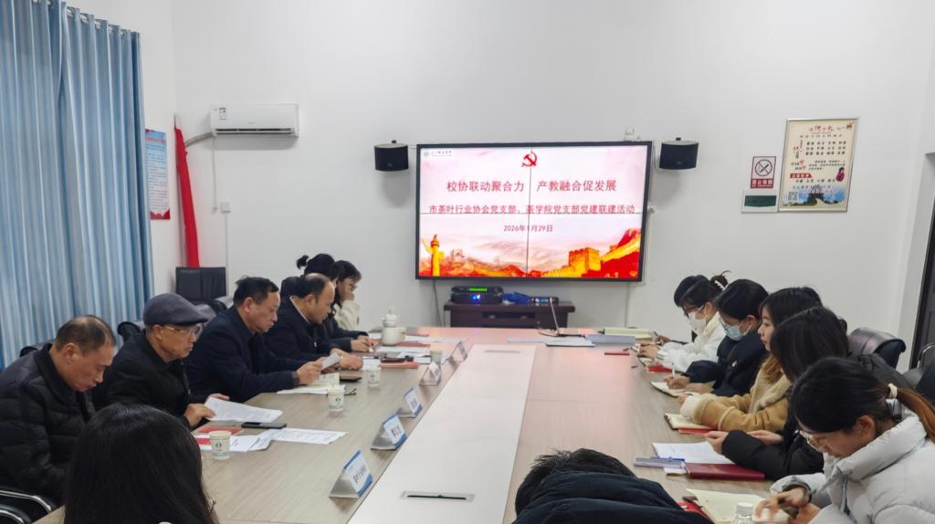 1月29日,天门市茶叶行业协会党支部与茶学院党支部在7301党员活动室联合开展“校协联动聚合力·产教融合促发展”主题党建联建活动。市茶叶行业协会支部党员代表与茶学院全体党员齐聚一堂,以党建为纽带搭建合作桥梁,共探产教融合新路径。