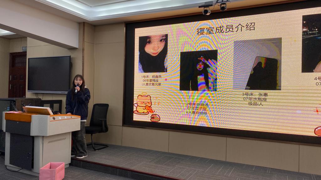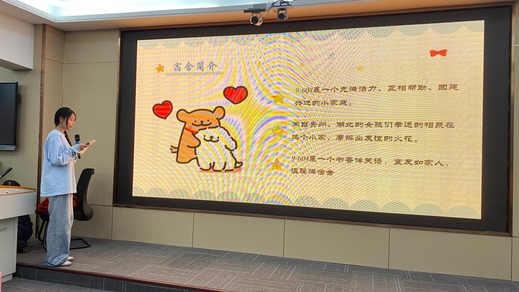 同学们通过PPT讲解、创意视频等多种形式,展现寝室文化与成员间的温暖故事。一个个真实动人的生活片段,从初识的好奇到朝夕相处的默契,展现了室友之间深厚的情谊,也赢得了现场阵阵掌声。