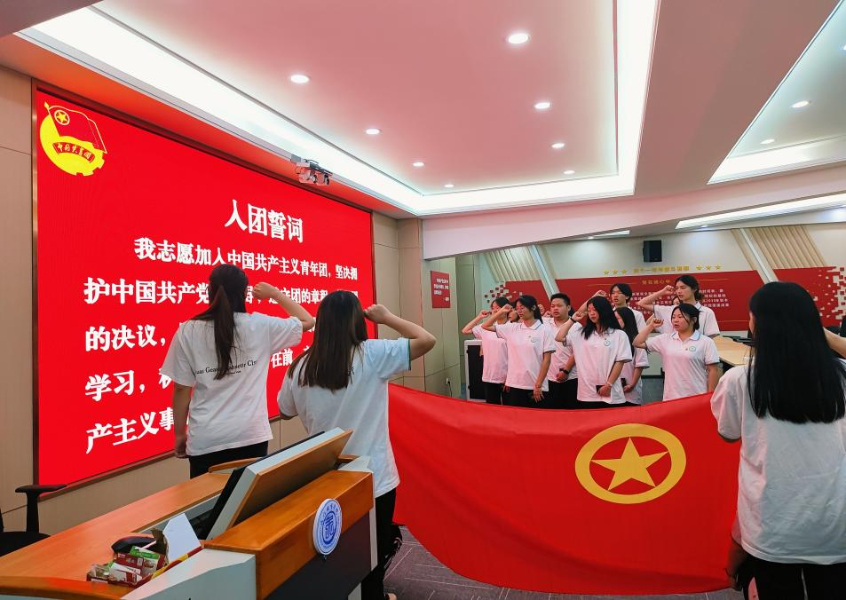 全体新团员在优秀团员代表李紫玉的带领下,面向团旗,举起右拳,庄严宣誓!