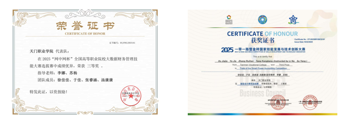 依托学院“以赛促学、以学促用”的育人机制,张睿涵在多项高水平竞赛中屡创佳绩。她代表学校参加“一带一路暨金砖国家技能发展与技术创新大赛”,凭借过硬的数据分析能力斩获全国一等奖;在2025年学生创新大赛中亦获得省赛铜奖。指导老师李娜表示:“张睿涵的竞赛经历充分验证了‘赛教融合’模式的有效性,她的创新思维与团队协作能力正是学院注重实践教学的成果。”