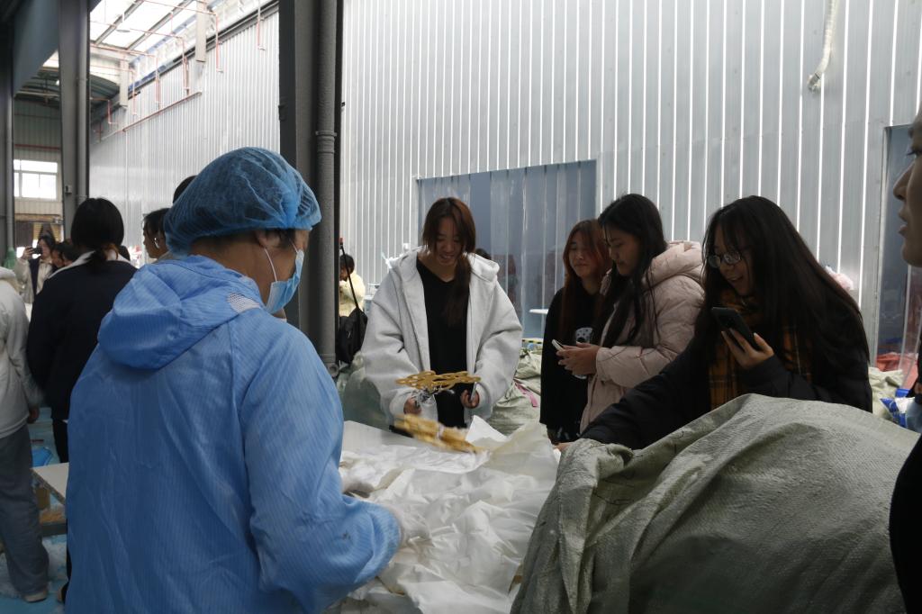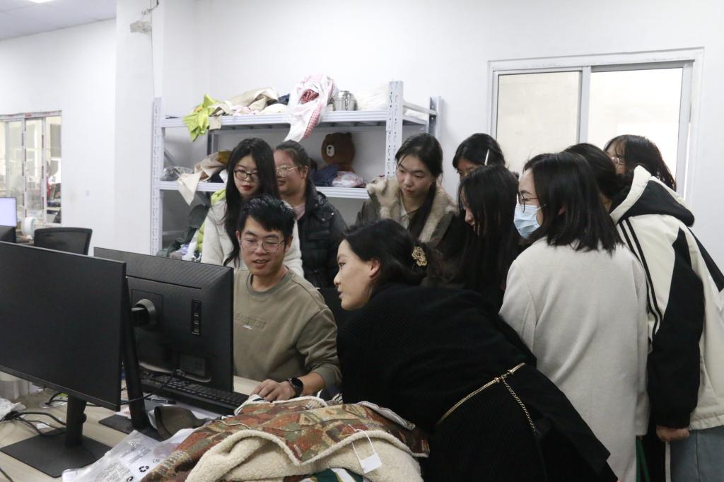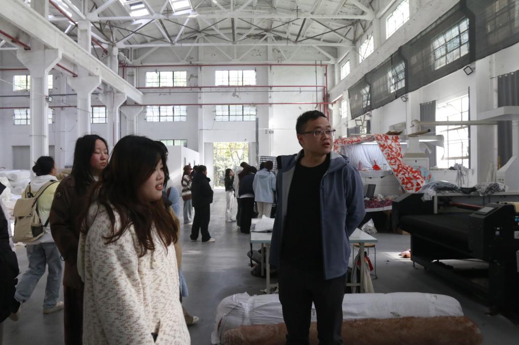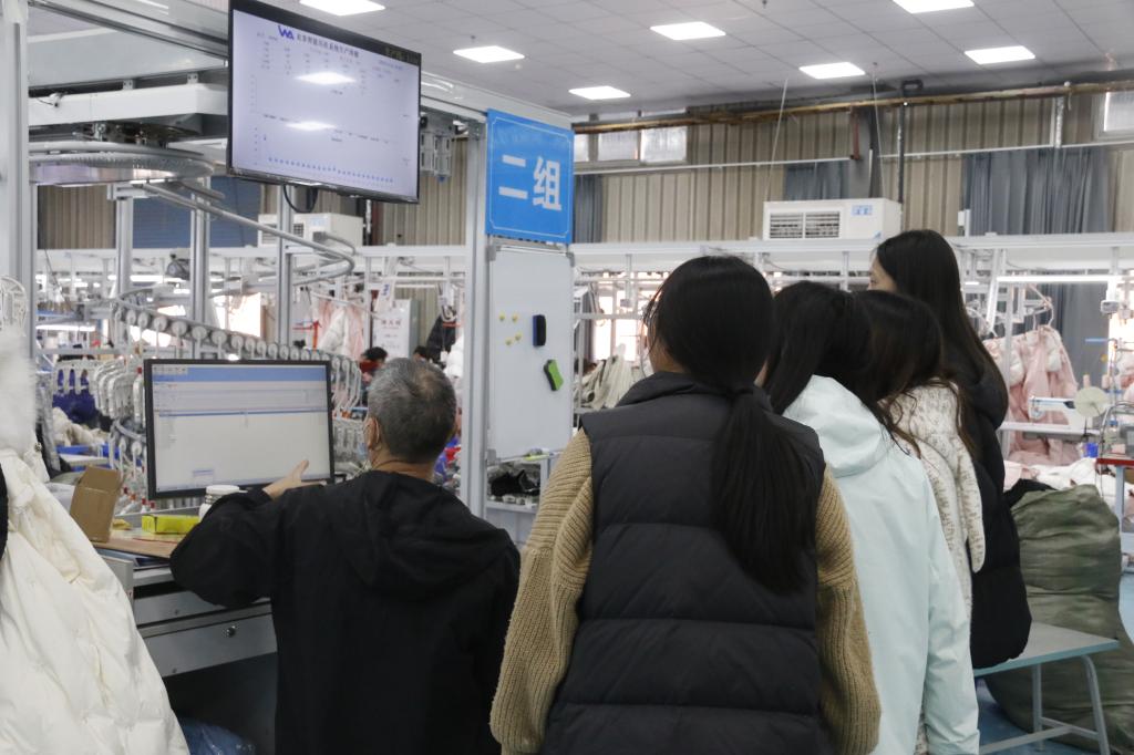 “欢迎天职的同学们来到‘实战战场’!”天门市起点供应链管理有限公司负责人、产业导师周煜一句开场白,瞬间点燃现场气氛。同学们跟随着导师的脚步,深入“原布印染—设计打样—成衣制造—选品中心—直播现场-运营复盘—仓配物流”全链路岗位:他们目睹AI辅助设计师快速完成纹样设计;布匹在同学们眼前快速自动的印上美丽的花纹;吊挂流水线上的成衣生产链在快速生产着一件件羽绒服,周煜热情的介绍道:“我们的羽绒服完全符合国家新国标90绒执行标准”;在直播间,同学们第一次直观感受到“颜色、克重、型号”如何决定爆款生死的节奏与心跳。