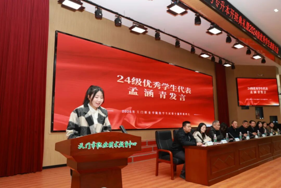 在典礼中,2024级优秀学生代表孟涵青进行了典型发言,分享了他们在自考学习中的心得与感悟,表达了对未来学习生活的憧憬和决心。他们的话语激励着在场的每一位同学,彰显了自考本科班学子的积极学习热情和坚定信念。