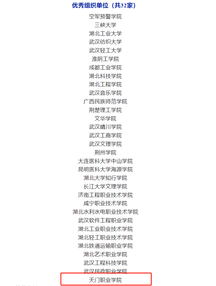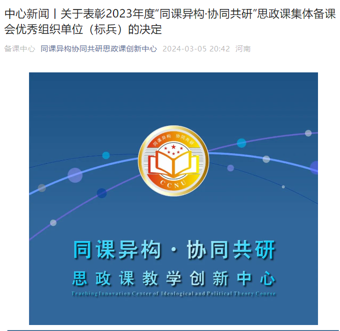 本网讯(通讯员 王倩倩)3月5日,全国高校思政课“手拉手”集体备课中心(华中师范大学—湖北省)、教育部第二批虚拟教研室建设试点单位高校思想政治理论课程群虚拟教研室、“同课异构·协同共研”思政课教学创新联盟秘书处结合对各成员单位对“同课异构·协同共研”思政课集体备课会的贡献情况、将“同课异构·协同共研”思政课集体备课会纳入本单位集体教研活动组织情况等方面的考察,对表现优异的单位进行表彰,评选出优秀组织单位标兵14家、优秀组织单位32家,天门职业学院荣获优秀组织单位。