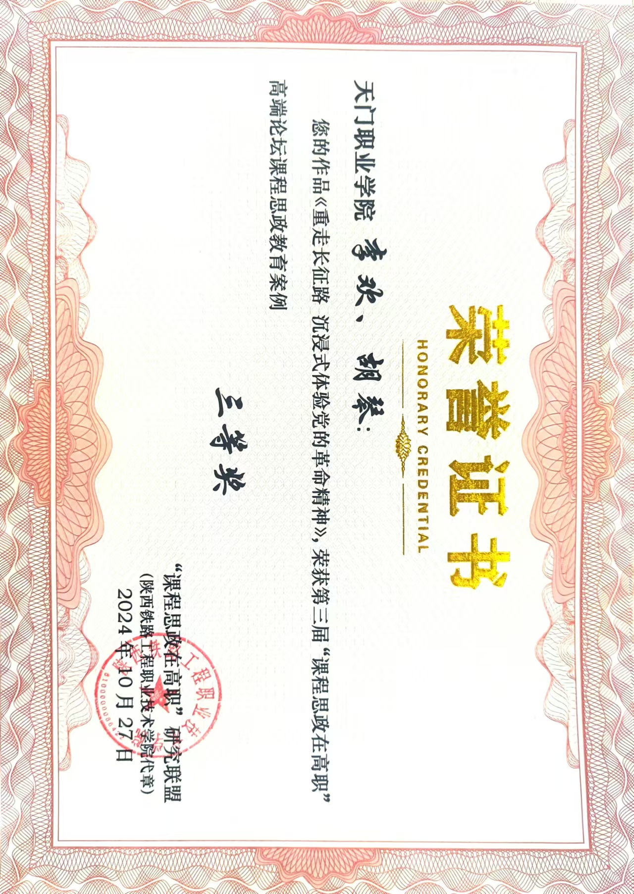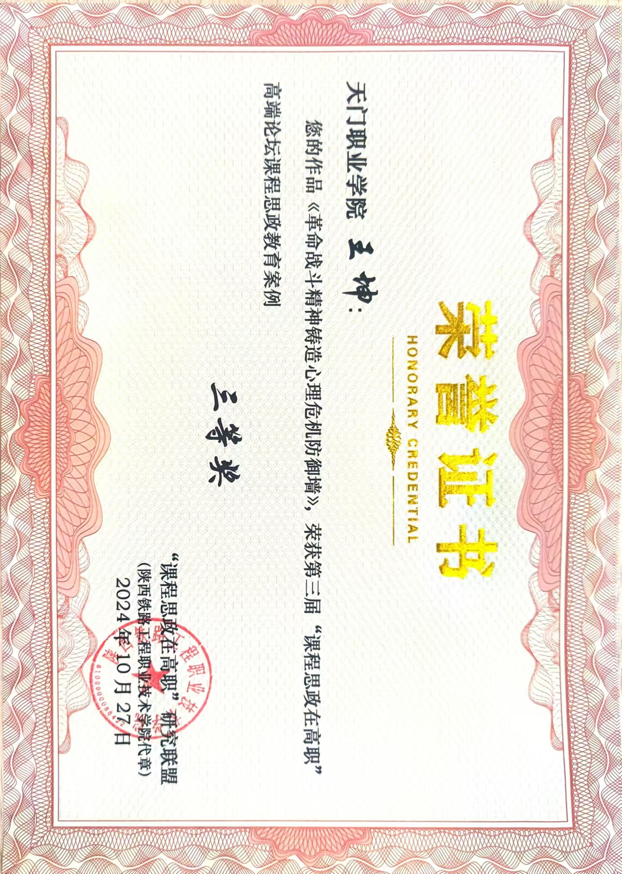 (通讯员:王坤)10月27日-10月29日,“课程思政在高职”第三届高端论坛在陕西铁路工程职业技术学院举办。来自全国各地20余所高等院校的领导、专家、学者60余人参加论坛,共同探讨“课程思政”在高等职业教育中的创新与实践。经过评审,我校思政教研室李欢、胡琴教师提交的特色案例《重走长征路 沉浸式体验党的命精神》和心理教研室王坤教师提交的特色案例《革命战斗精神铸造心理危机防墙》均荣获本次论坛课程思政教育案例三等奖。