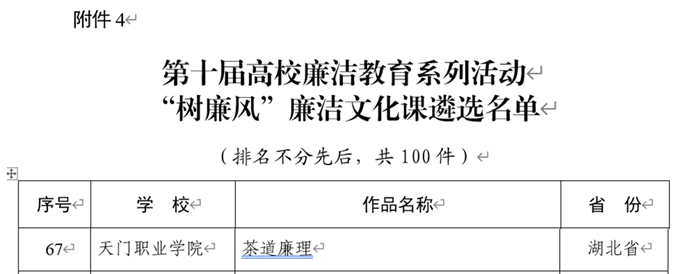 近日,教育部公示第十届高校廉洁教育系列活动遴选结果,我校马克思主义学院创作报送的作品《茶道廉理》成功入选“树廉风”廉洁文化课遴选名单。实现了我校在该全国性赛事中的首次突破,这份成绩的取得,不仅是教育部、教育厅对我校廉洁工作的高度重视,更是我校持续深耕文化建设的有力见证。