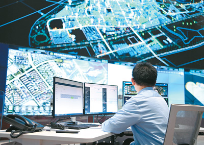 在天津市滨海新区中新天津生态城智慧城市运营中心内,工作人员在查看监控。 新华社记者 赵子硕摄 |