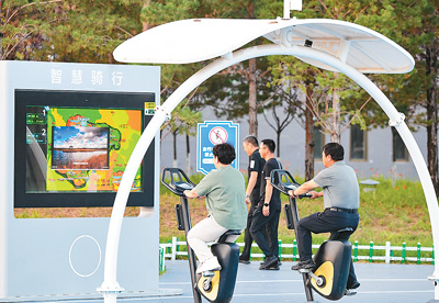 在内蒙古自治区鄂尔多斯市康巴什区智慧体育公园,市民使用智慧骑行器械健身。 王 正摄(人民视觉) |