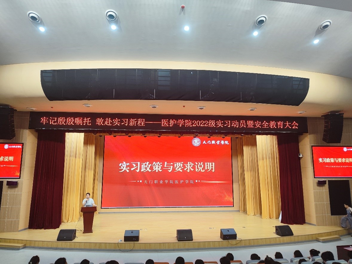 为保障我院2022级学生实习工作顺利进行,帮助学生正确认识就业形势与实习的意义,快速适应角色转换,从容应对实习,6月19日至20日,医护学院召开2022级实习动员暨安全教育大会。医护学院院长王冰,院党支部副书记赵梦丹,副院长胡伟伦出席会议。2022级辅导员及全体实习生参加。