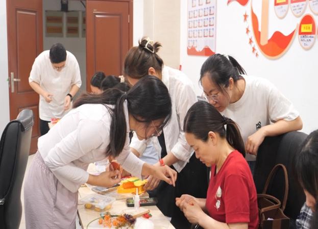 活动中,无需任何手工经验的老师们全情投入,沉浸在手作带来的独特魅力中。捏塑黏土时的专注、串珠时的耐心、缝纫时的细致、粘贴干花时的巧思、组装钥匙扣时的创意,都让大家暂时忘却了工作的紧张。看着自己手中逐渐成型的可爱娃娃、闪亮手链、实用小包、雅致团扇或个性钥匙扣,成就感和满足感油然而生。现场气氛温馨融洽,欢声笑语不断,老师们纷纷表示,这不仅仅是一次手工体验,更是一次难得的“心灵充电”之旅。