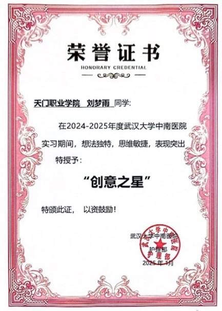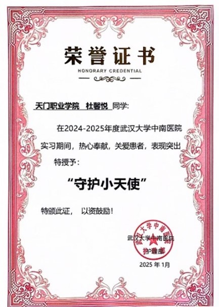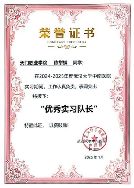 1月7日,在武汉大学中南医院举办的“护理之路当奋斗,中南有我正青春”优秀实习生表彰活动中,我校护理2206班刘梦雨凭借在实习工作中的创新思维和独特创意,荣获“创意之星”称号,护理2203班杜馨悦以无微不至的关怀和扎实的专业技能,赢得“守护小天使”的美誉,护理2208班陈举蝶作为实习队长,以出色的组织才能和团队协作精神,带领团队高效开展各项实习任务,收获一致好评,成功摘得“优秀实习队长”荣誉。