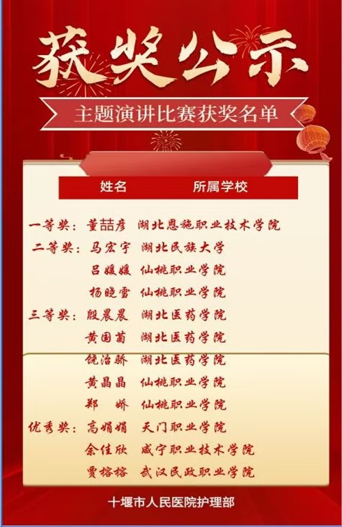 11月15日,在十堰市人民医院举办的主题演讲比赛中,我校护理2209班高娟娟获得优秀奖,展现了严谨笃实的护理精神和护理新人的蓬勃朝气。