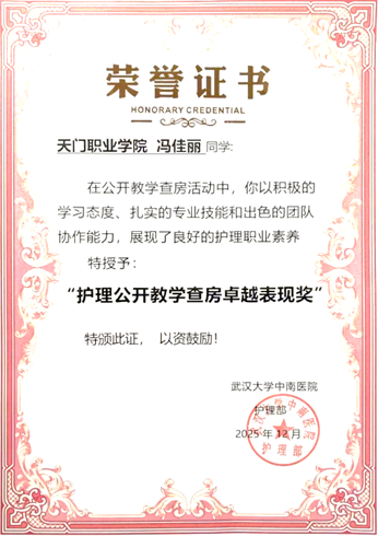 在2025-2026学年武汉大学中南医院实习生考核及教学系列活动中,医护学院实习生冯佳丽表现优异,凭借扎实的专业功底和出色的现场发挥,接连斩获两项荣誉。