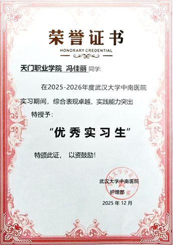 在武汉大学中南医院组织的实习生综合考核中,冯佳丽同学受到各科室带教老师的广泛好评,荣获“优秀实习生”称号。这不仅是对其日常实习工作的肯定,更是对其综合职业素养的高度认可。