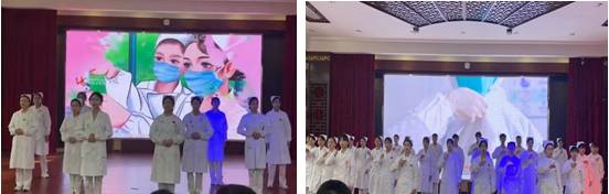 护生宣誓 实习生代表赵良实发言 医护学院党支部书记王冰宣布2021—2022学年先进班集体、文明寝室及三好学生等名单,嘉宾及老师为获得荣誉称号的学生颁奖。