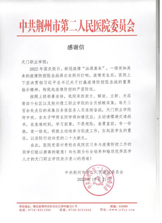 本网讯(通讯员:张如意)“天门职业学院何中欢、吉木子呷两名同学得知情况后,主动请缨递交请战书,在危难时刻,学习前辈,不畏艰险,奋勇直前,有一份热,发一份光,积极主动地参与抗疫工作,扛起医学生的重任,以实际行动向党的二十大献礼……”近日,我校收到了一封来自荆州市第二人民医院发来的感谢信,信中对我校2020级护理专业实习生何中欢、吉木子呷两位同学参与当地疫情防控志愿服务表示衷心的感谢。