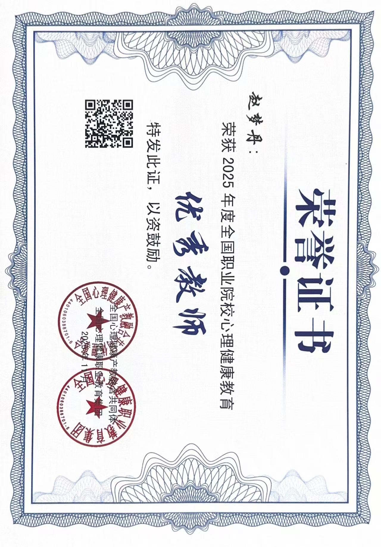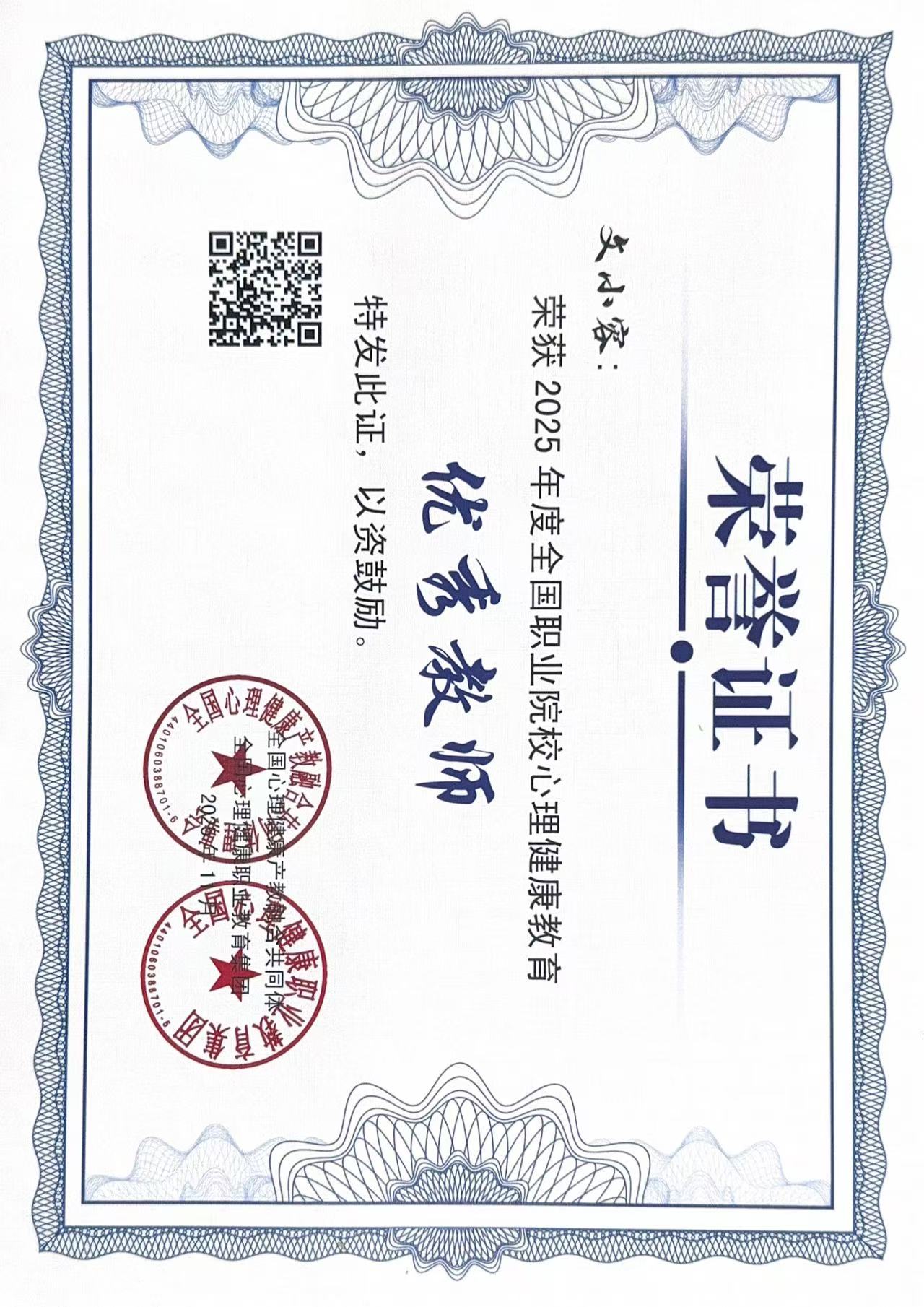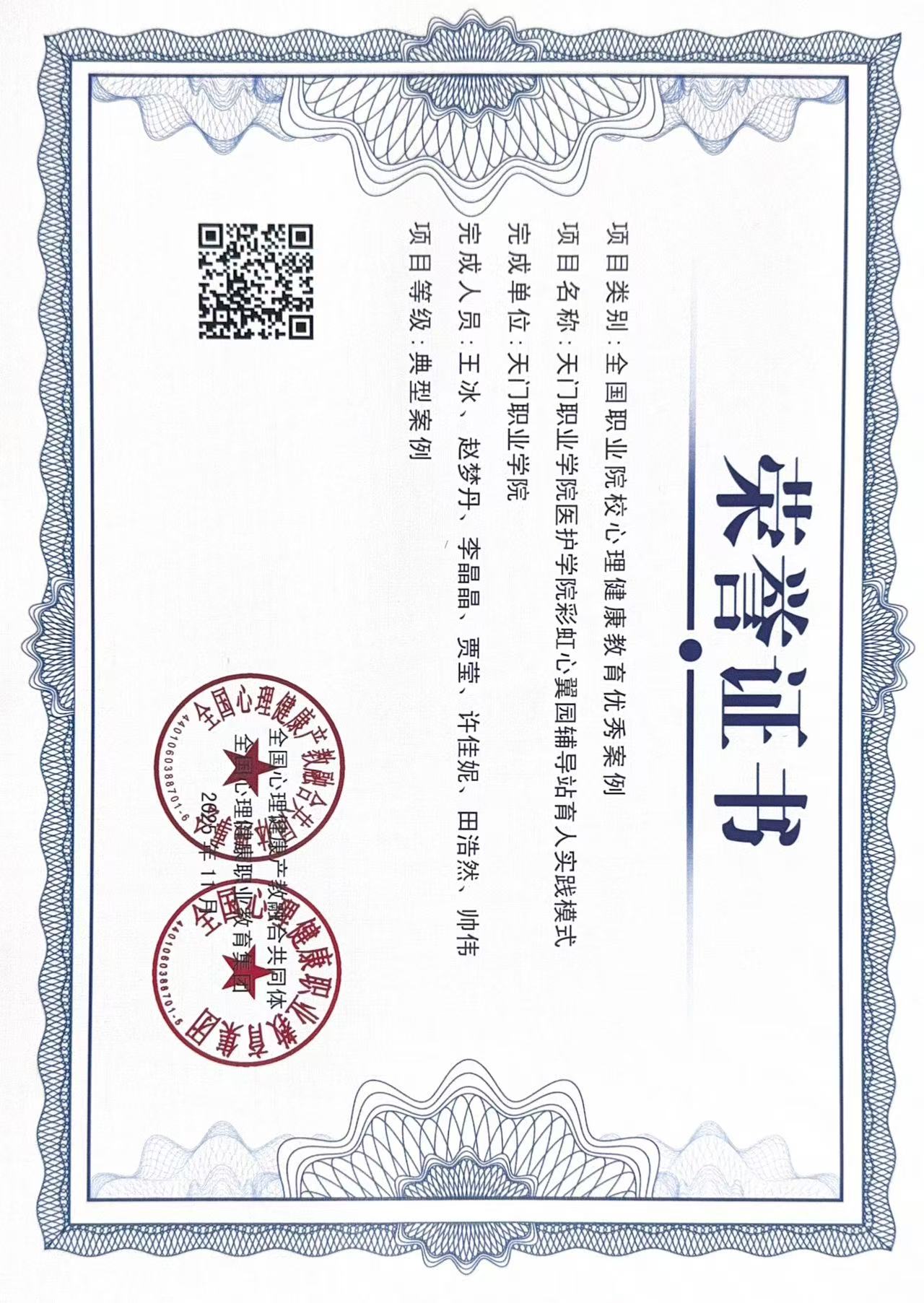 会上对职业院校心理健康教育典型优秀案例、全国职业院校心理健康教育先进单位、全国职业院校心理健康教育先进个人进行了颁奖,我院参赛案例《天门职业学院医护学院彩虹心翼园辅导站育人实践模式》获评全国职业院校心理健康教育优秀案例,医护学院党支部副书记赵梦丹、马克思主义学院专职心理教师文小容荣获2025年度全国职业院校心理健康教育优秀教师。