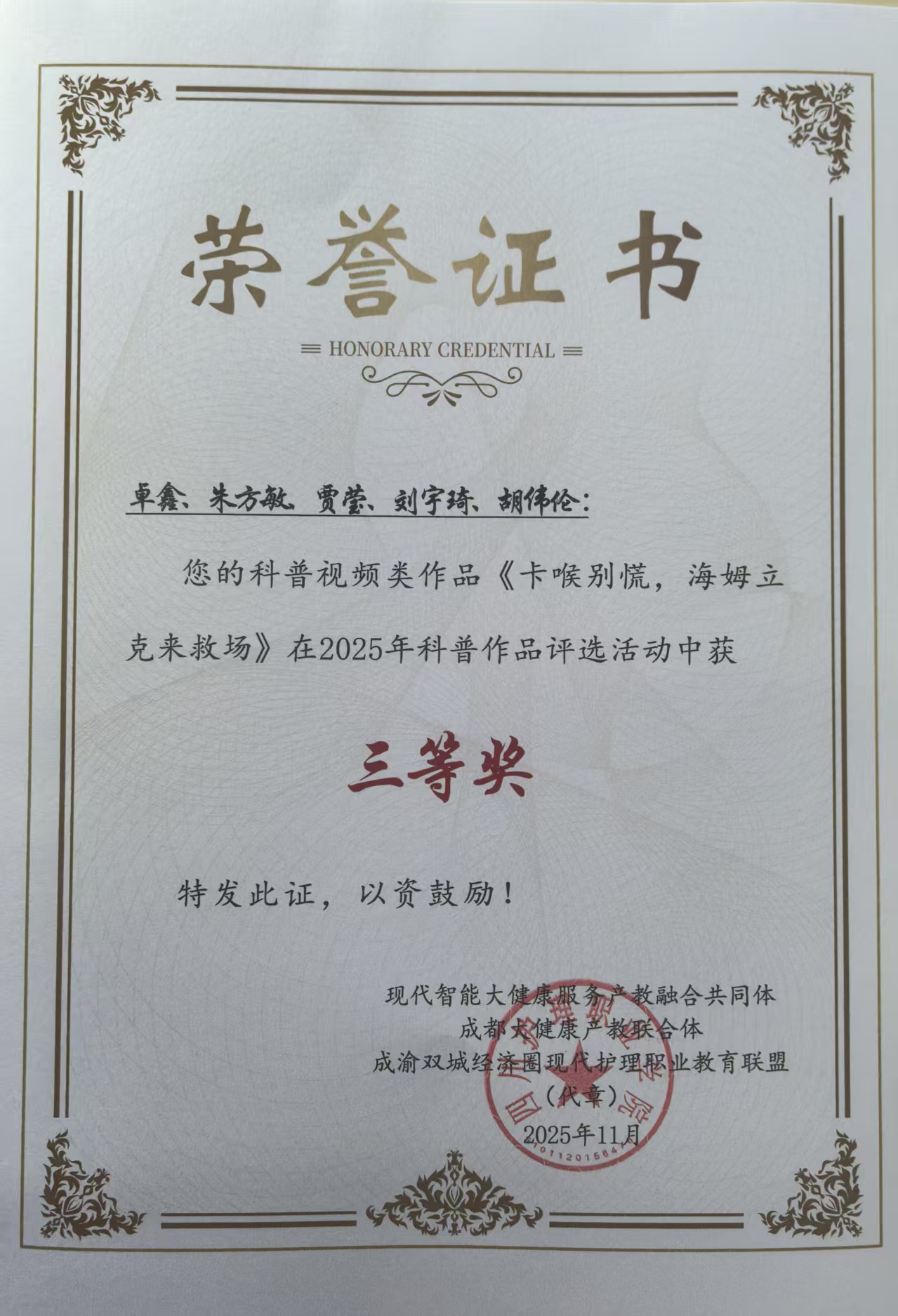 会上,揭牌成立了西部首个智慧康养产业学院——四川护理职业学院德阳文旅大健康智慧康养产业学院,举行了共同体、联合体和联盟2025年度科普作品颁奖仪式和科研项目申报指南发布仪式,并为现代智能大健康服务产教融合共同体副理事长单位授牌。我院由卓鑫、朱方敏、贾莹、刘宇琦、胡伟伦拍摄的《卡喉别慌,海姆立克来救场》、朱方敏、贾莹、卓鑫、刘宇琦、胡伟伦拍摄的《别让水冲跑止咳效果》均获得科普视频类作品三等奖。
