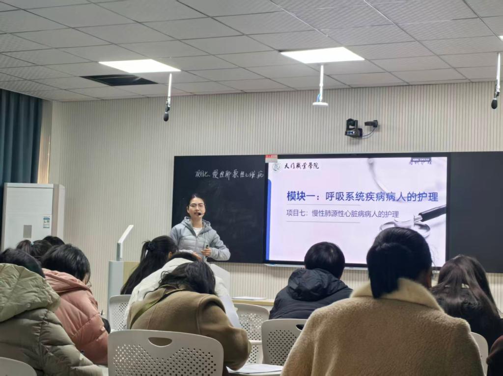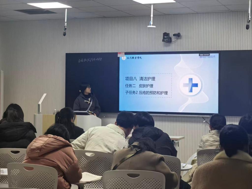 汇报课上,四位主讲教师结合专业课程特点,精心设计教学内容、创新教学方法。邓典典老师以“跌倒评估”为核心,讲授《老年综合能力评估》课程要点;刘以萱老师聚焦《内科护理学》中“慢性肺源性心脏病患者的护理”,注重理论与临床实践结合;刘航志老师在《人体形态结构》课堂上,以“心”为教学重点,通过清晰讲解助力学生构建知识体系;易林洁老师围绕《基础护理学》“压疮的预防和护理”内容,强化实操技能指导。授课过程中,老师们教态自然、逻辑清晰,充分展现了近期“传帮带”培养的阶段性成果,也彰显了自身的教学潜力与风采。