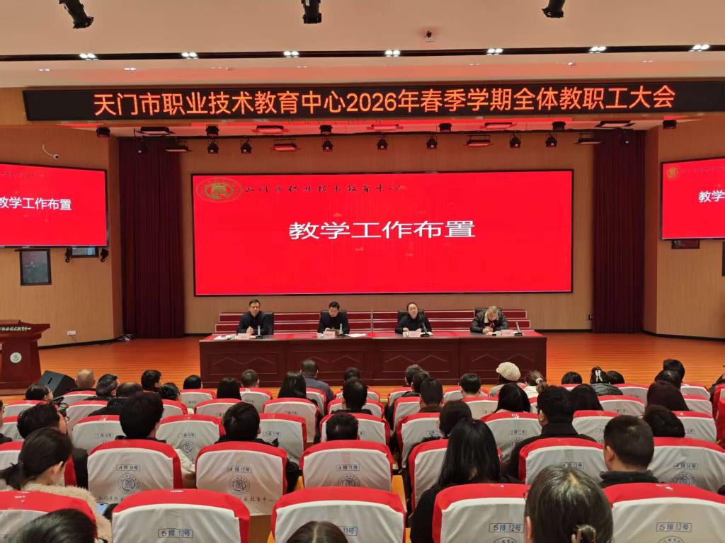 春回大地,万象更新。为统筹部署新学期各项工作,凝聚教职工奋进力量,2026年2月28日9:00,天门市职业技术教育中心在报告厅召开2026年春季全体教职工大会。全体教职工参会,会议围绕师德师风、教学安排、后勤保障及全年工作部署展开,为学校高质量发展划定重点、明确方向。