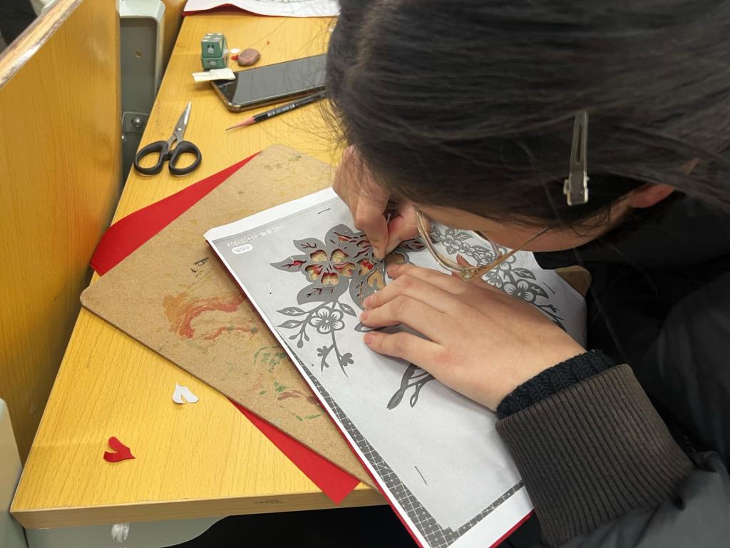 活动第二阶段则是剪纸大赛,100余名选手现场动手完成参赛作品。同学们满怀热情与信心,展示了自己在剪纸课程中所习得的剪纸技艺以及独特创意,他们手持工具,神情专注,在纸张上精心雕琢。一时间,纸屑纷落,一张张普通的宣纸在他们的巧手下逐渐变成了栩栩如生的花朵、动物和人物等形象。