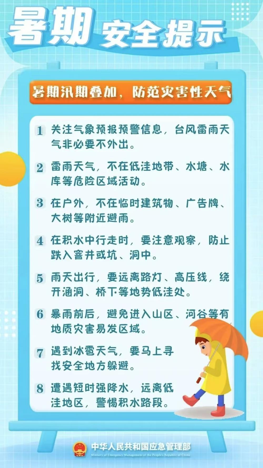 暑期已至,为确保大家度过一个平安、充实的假期,结合近期汛期灾害天气频发、高温持续等情况,特此提醒同学们注意以下安全事项,务必牢记心间,防患于未然。