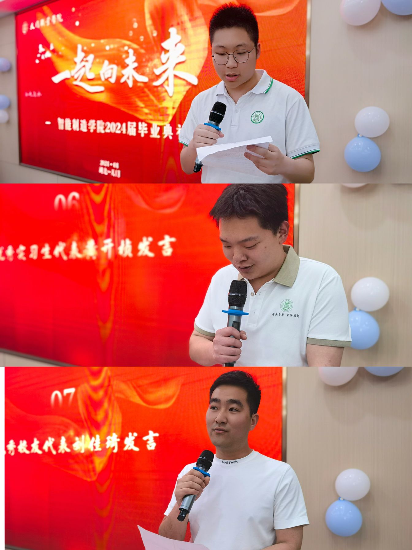 优秀毕业生陈真金和优秀实习生代表黄开桢、校友代表刘佳琦依次上台发言,他们回顾了在学校奋战学业、专注技能提升,投身学生工作的三年大学时光,根据自身的实习或者工作经验,为毕业生们送上了临别寄语。