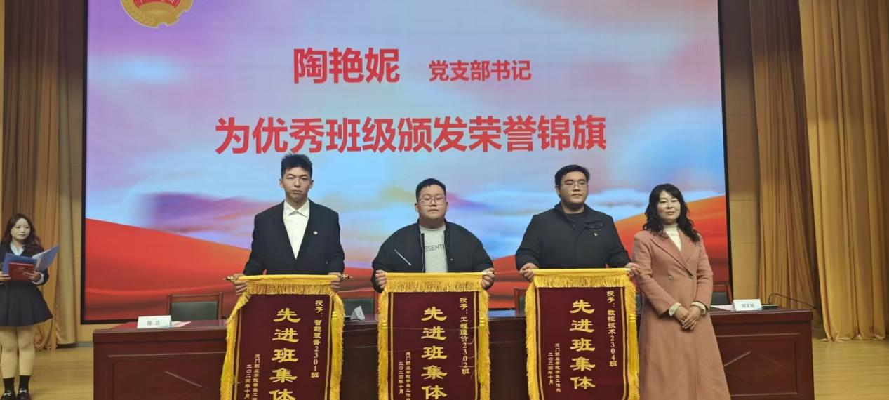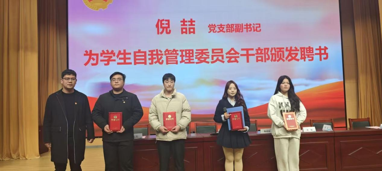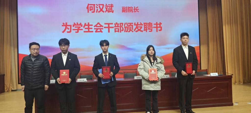 活动中,学生会、自管会各部门依次上台发言,对各部门职责进行了简要介绍,也表达了他们对未来工作的精心规划与宏伟展望,更展示了他们为学院发展全力以赴的决心与信念。学院院长陈鹏和党支部副书记倪喆分别为学生会、自管会学生干部颁发聘书;副院长何汉斌为优秀学生干部颁发荣誉证书;党支部书记陶艳妮为优秀班集体颁发锦旗。