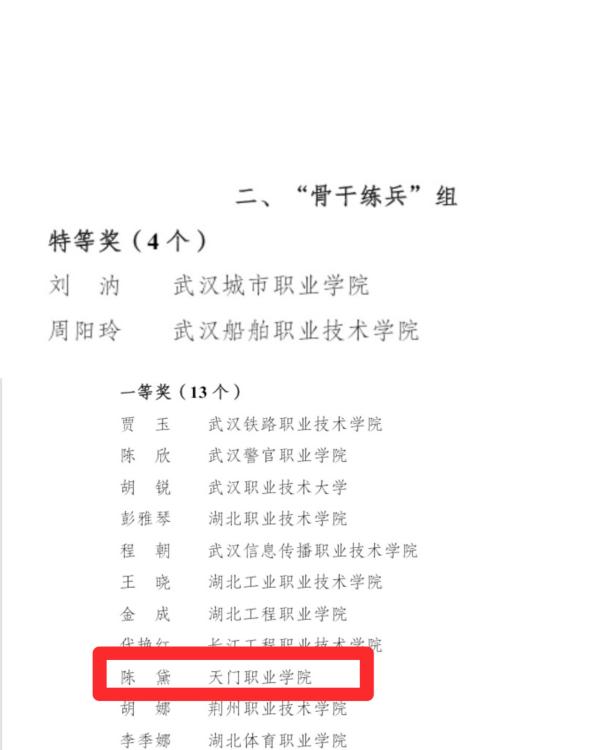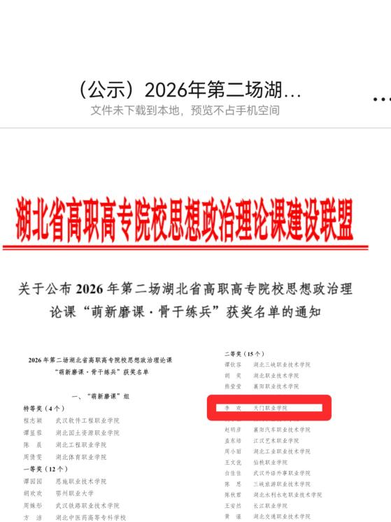 春和景明,研学同行。2026年3月21日,由湖北省高职高专院校思想政治理论课建设联盟主办、武汉软件工程职业学院承办的2026年湖北省第二场高职高专思政课“萌新磨课、骨干练兵”教学展示活动在武汉荷田大酒店顺利举办。天门职业学院马克思主义学院副院长赵敏带队,组织学院青年教师赴现场观摩学习,活动现场捷报传来——经过多轮激烈角逐,我校教师陈黛斩获骨干组一等奖,李欢荣获萌新组二等奖,与来自全省30余所高职高专院校的思政教育同仁共探教学创新路径,共话育人使命担当。