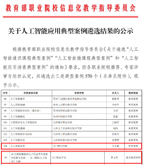 近日,教育部职业院校信息化教学指导委员会公布了“人工智能应用典型案例”征集遴选结果。我校申报的2个项目成功入选。其中,《人工智能素养》案例入选为典型案例、《AI全流程赋能的电子信息类专业教学创新与实践—以<模拟电子技术>为例》(李文莉老师主持)入选为优秀案例。